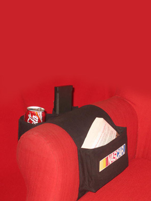 Inside pocket holds books or small magazines. The outside of the caddy has two pockets: one is insulated and holds beverages and the other holds remote controls. Outside pockets have NASCAR driver's names and numbers. Fabric caddy drapes over the chair arm. |